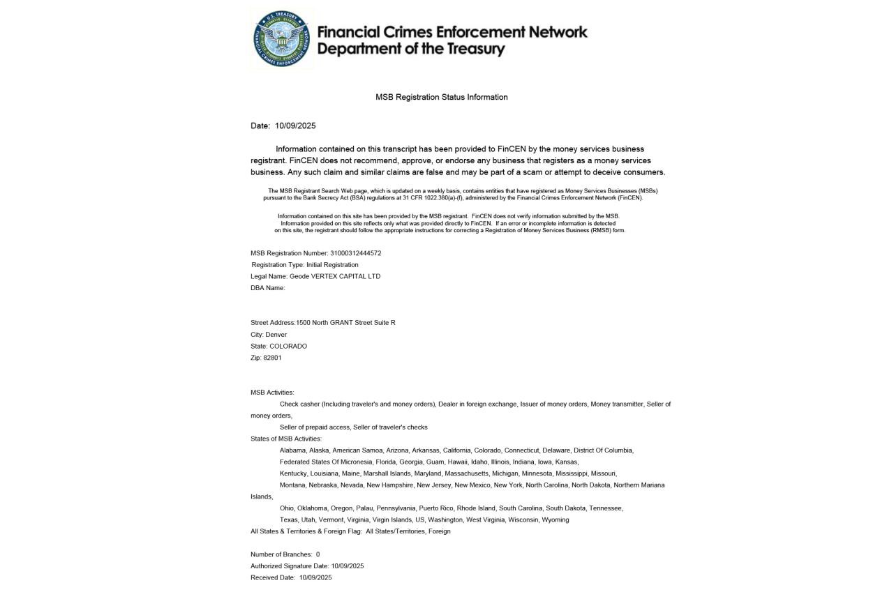 ABD merkezli ve global ölçekte faaliyet gösteren yenilikçi bir finans kurumu olarak Geode Vertex Capital, global ölçekte uyumlu operasyon ve fon güvenliğini sağlamak amacıyla ABD tarafından resmi olarak onaylanmış MSB (Money Services Business) finansal hizmet lisansına sahiptir.